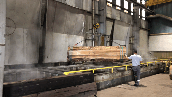 The raw flitches are then moved by overhead crane from the saw operator to huge vats of boiling hot water. The heat and moisture soften the wood, ensuring it is pliable and ready for precise slicing into thin veneer sheets. This cooking process is the most crucial stage of veneer manufacturing. Timing is critical; too much time in the water can cause the log to change colour, while too little time will make the wood very hard to cut. Improper timing can lead to buckling and rough cutting, affecting the quality of the veneer.
