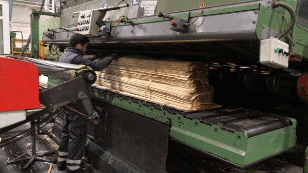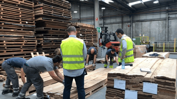 After the veneer has been sliced, it is soaking wet from its previous bath. It is then transported to the dryers, where the drying process begins. The wet veneer is laid on a flat bed, which then raises up. An agent then lifts each individual sheet, where an overhead vacuum bed holds the veneer and runs it through the entire length of the dryer. These dryers are as long as an Olympic-sized swimming pool. At the end of this machine, there are two agents who stack the dry veneer into bundles, ready for the next step: clipping. This drying process is essential for removing excess moisture from the veneer, ensuring it is stable and ready for further processing.